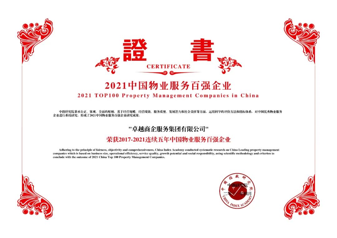 卓越商企服務集團有限公司憑借業(yè)內領先的綜合實力和服務水平,榮膺“2017-2021連續(xù)五年物業(yè)服務百強企業(yè)”,并在專項物業(yè)服務領域研究中榮獲“2021辦公物業(yè)管理優(yōu)秀企業(yè)”,旗下卓品商務服務有限公司榮獲“2021物業(yè)服務多種經營優(yōu)秀企業(yè)”。