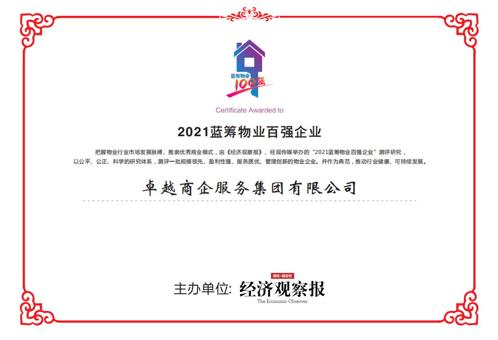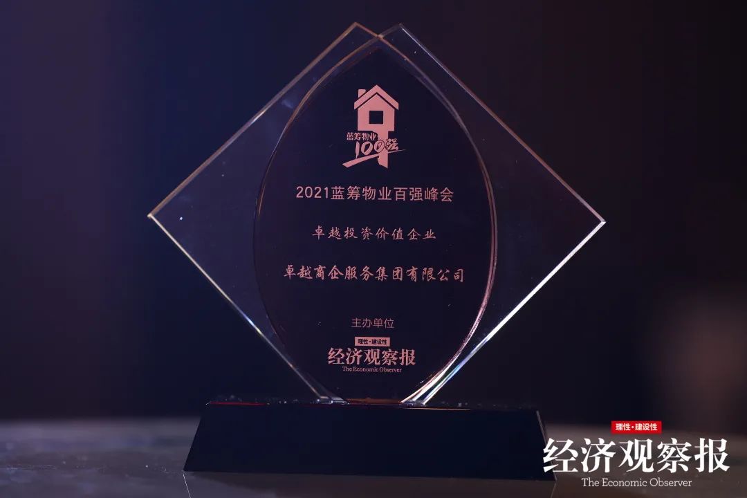 在本次行業(yè)峰會上,卓越商企服務(wù)憑借在行業(yè)領(lǐng)先的綜合實力和服務(wù)水平,以及在商務(wù)物管領(lǐng)域的深厚實力,獲得“2021藍(lán)籌物業(yè)百強企業(yè)”、“2021卓越投資價值企業(yè)”兩項大獎,卓