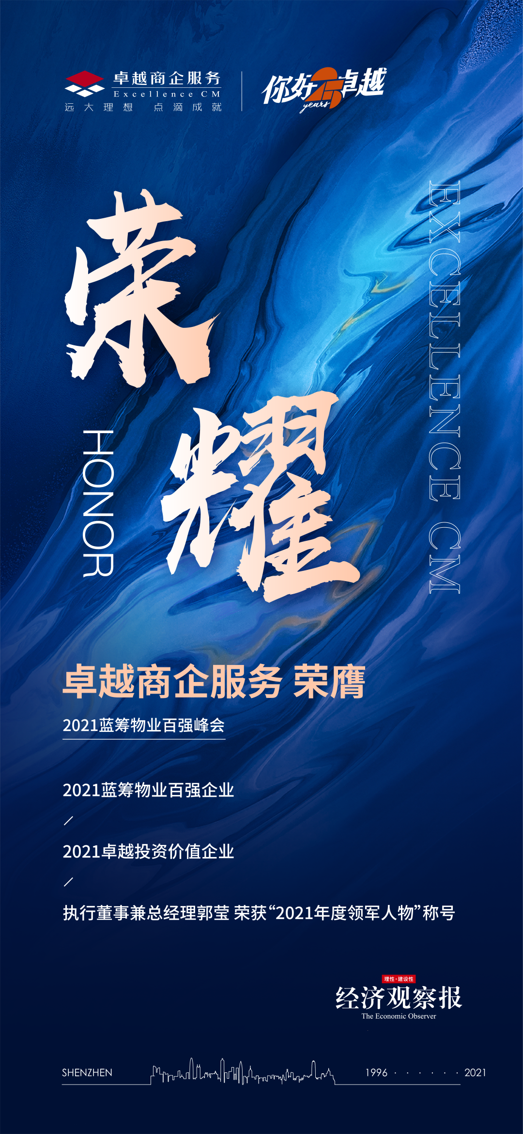 越商企服務(wù)集團(tuán)有限公司執(zhí)行董事兼總經(jīng)理郭瑩榮獲“2021年度領(lǐng)軍人物”稱號,更進(jìn)一步證明了社會和行業(yè)對于卓越商企服務(wù)的認(rèn)可。