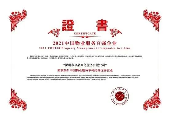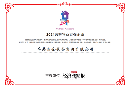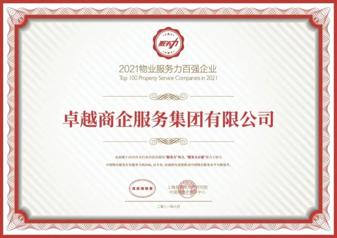 成功入圍百強(qiáng)企業(yè),卓越商企服務(wù)榮獲“2021中國物業(yè)服務(wù)企業(yè)服務(wù)力百強(qiáng)企業(yè)”、“2021中國辦公物業(yè)服務(wù)力20強(qiáng)企業(yè)(TOP3)稱號。
