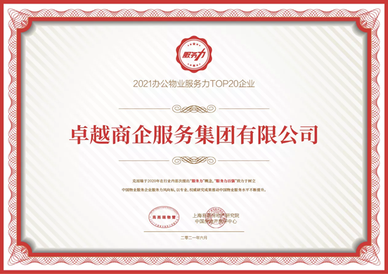 持續(xù)開拓,屢創(chuàng)佳績。卓越商企服務(wù)榮膺“2017-2021連續(xù)五年中國物業(yè)服務(wù)百強(qiáng)企業(yè)”(TOP14)、“2021中國辦公物業(yè)管理優(yōu)秀企業(yè)”(TOP2)、卓品商務(wù)服務(wù)有限公司榮獲“2021中國物業(yè)服務(wù)多種經(jīng)營優(yōu)秀企業(yè)”。卓越商企服務(wù)于2021年正式被納入MSCI中國全股票小型股指數(shù)。