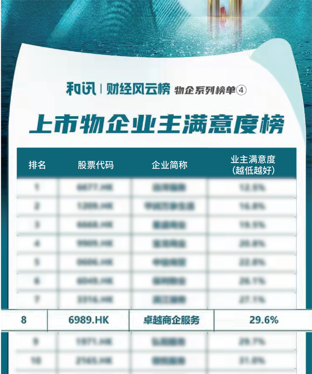 值得慶賀的是,在同期發(fā)布的和訊“中國(guó)財(cái)經(jīng)風(fēng)云榜“上,卓越商企服務(wù)更是憑借優(yōu)異的財(cái)務(wù)表現(xiàn)和權(quán)威測(cè)評(píng),榮登“2021上市物企業(yè)主滿(mǎn)意度榜TOP8”。