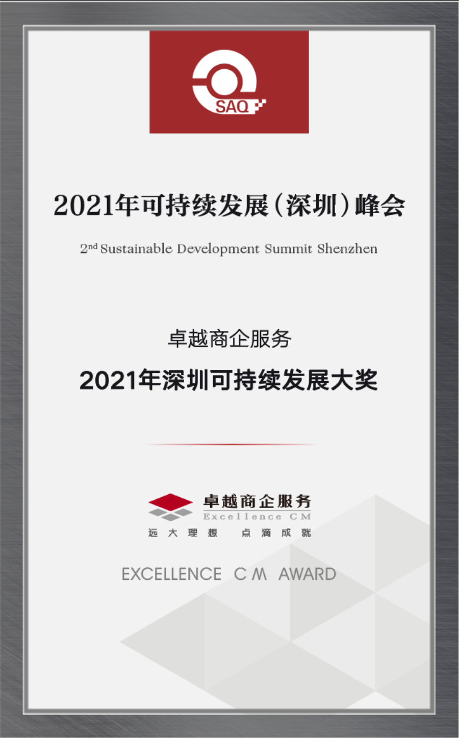 本次峰會上,卓越商企服務(wù)(股票代碼:6989.HK)憑借科學(xué)完善的可持續(xù)發(fā)展經(jīng)營能力、樓宇綠色低碳管理實踐,從眾多參評的知名企業(yè)中脫穎而出,榮膺“2021深圳可持續(xù)發(fā)展大獎(經(jīng)濟類)”,再一次證明了卓越商企服務(wù)在高質(zhì)量發(fā)展的同時,遵循ESG企業(yè)可持續(xù)發(fā)展思路,長期以來在綠色物業(yè)、能源管理、環(huán)境管理、企業(yè)社會責(zé)任及可持續(xù)發(fā)展方面的卓越表現(xiàn),同時也體現(xiàn)了政府、社會組織各界專家、領(lǐng)導(dǎo)對卓越商企服務(wù)在引領(lǐng)行業(yè),打造城市可持續(xù)發(fā)展、綠色低碳運營方面寄予的厚望。