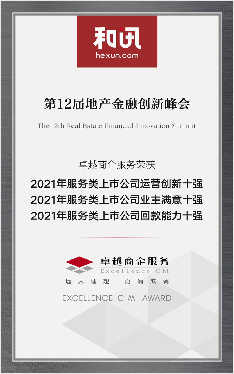 2021年12月16日,由SEEC、和訊網(wǎng)、財(cái)經(jīng)中國會(huì)主辦的“第十九屆財(cái)經(jīng)風(fēng)云榜第12屆地產(chǎn)金融創(chuàng)新峰會(huì)”在上海圓滿舉行。卓越商企服務(wù)(6989.HK)斬獲“2021年服務(wù)類上市公司運(yùn)營創(chuàng)新十強(qiáng)”、“2021年服務(wù)類上市公司業(yè)主滿意十強(qiáng)”、“2021年服務(wù)類上市公司回款能力十強(qiáng)”多項(xiàng)殊榮。同時(shí),祝賀卓越集團(tuán)榮膺“2021年房地產(chǎn)企業(yè)品牌影響力榜樣”、“2021年房地產(chǎn)企業(yè)優(yōu)秀產(chǎn)品力榜樣”兩項(xiàng)大獎(jiǎng);