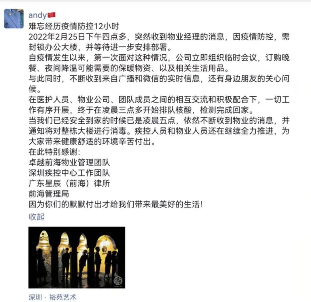 2022年2月25日,卓越前海壹號3號樓、7號樓、8號樓因疑似病例封控后,項目物業(yè)團隊全程做好客戶安撫、特殊人群信息統(tǒng)計、協(xié)助核酸檢測、秩序維護和后勤保障工作,保障6000多名客戶的衣食住行,直至3月4號全部解封。