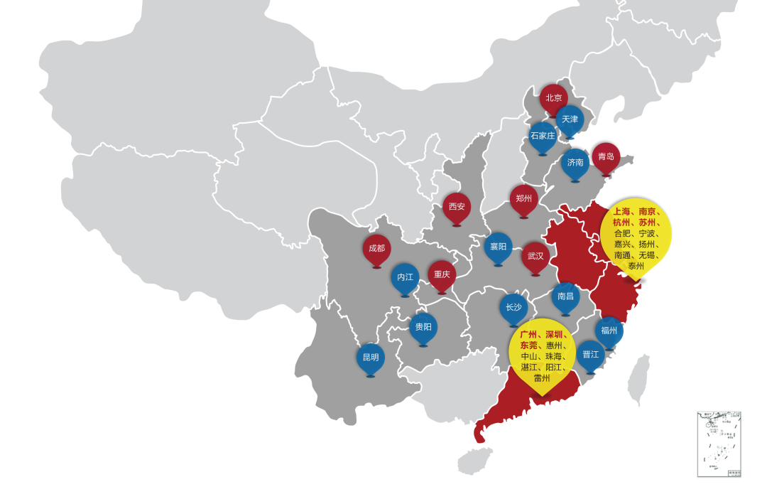 大灣區(qū)、長三角地區(qū)及重點城市布局