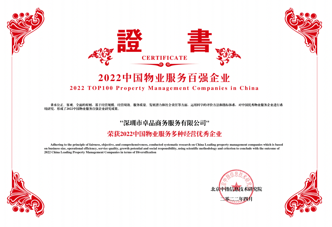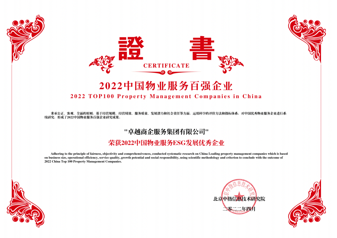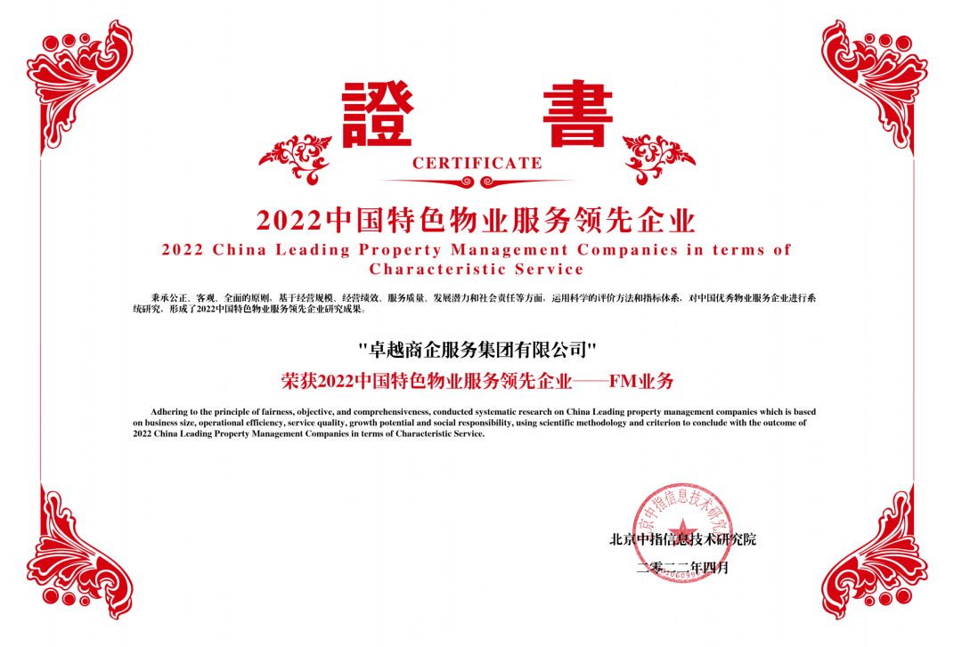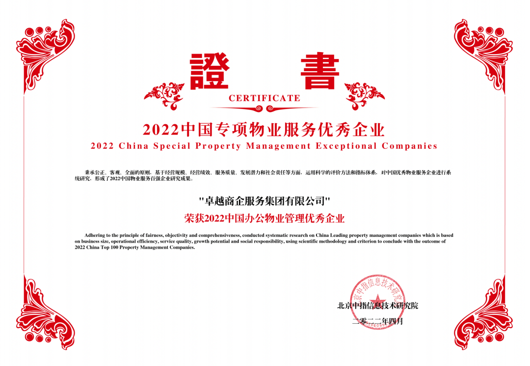卓越商企服務(wù)集團(tuán)有限公司憑借業(yè)內(nèi)領(lǐng)先的綜合實(shí)力和服務(wù)水平,被評(píng)為“2022中國(guó)物業(yè)服務(wù)百強(qiáng)企業(yè)”、“2022中國(guó)辦公物業(yè)管理優(yōu)秀企業(yè)”、“2022中國(guó)特色物業(yè)服務(wù)領(lǐng)先企業(yè)-FM業(yè)務(wù)“、”2022中國(guó)物業(yè)服務(wù)多種經(jīng)營(yíng)優(yōu)秀企業(yè)“、“2022中國(guó)物業(yè)服務(wù)ESG發(fā)展優(yōu)秀企業(yè)”。