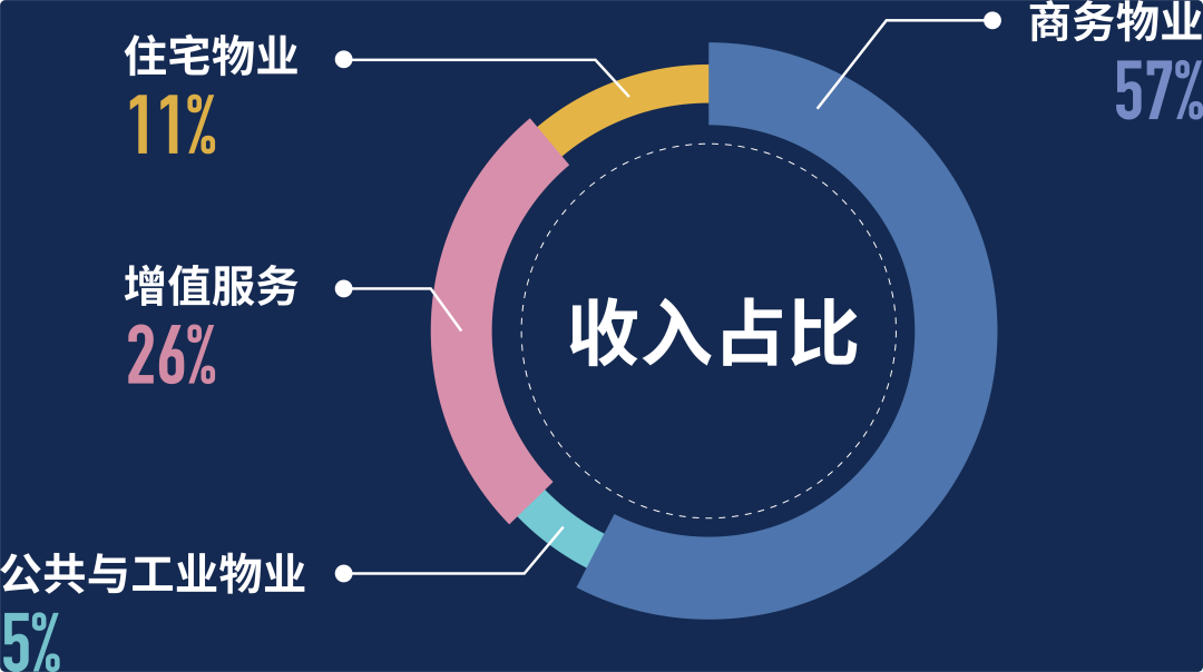從各業(yè)務(wù)類型收入占比來看,商務(wù)物業(yè)、公共與工業(yè)物業(yè)、住宅物業(yè)、增值服務(wù)分別占比57%、5%、11%、26%。在經(jīng)營收入持續(xù)穩(wěn)定增長的同時,收入結(jié)構(gòu)實現(xiàn)多元、均衡健康發(fā)展。