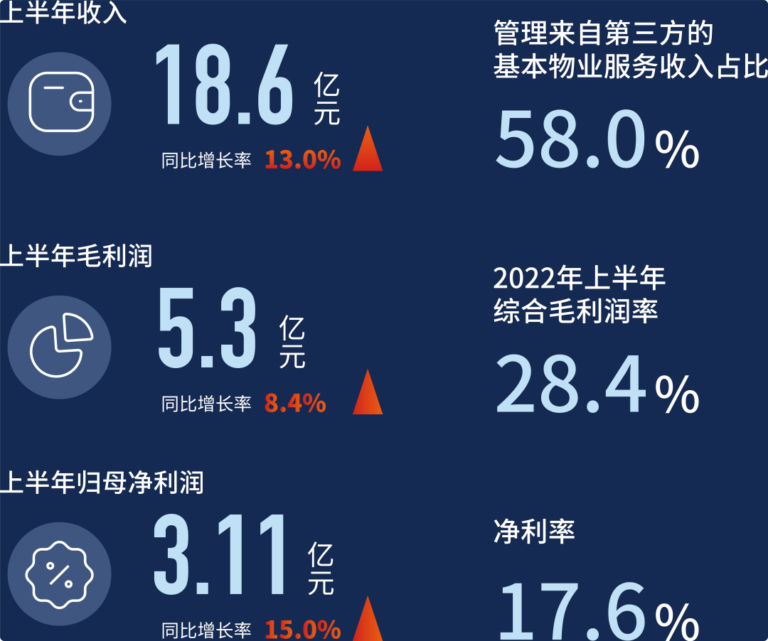 2022年上半年公司營業(yè)收入實現(xiàn)18.6億元,同比增長13%,其中來自第三方的基本物業(yè)服務(wù)收入占比為58%;毛利潤5.3億元,同比增長8.4%,綜合毛利率28.4%;歸母凈利潤3.11億元,同比增長15%;凈利率17.6%,與去年同期持平。上市以來連續(xù)四期為正流入,在手現(xiàn)金充裕。