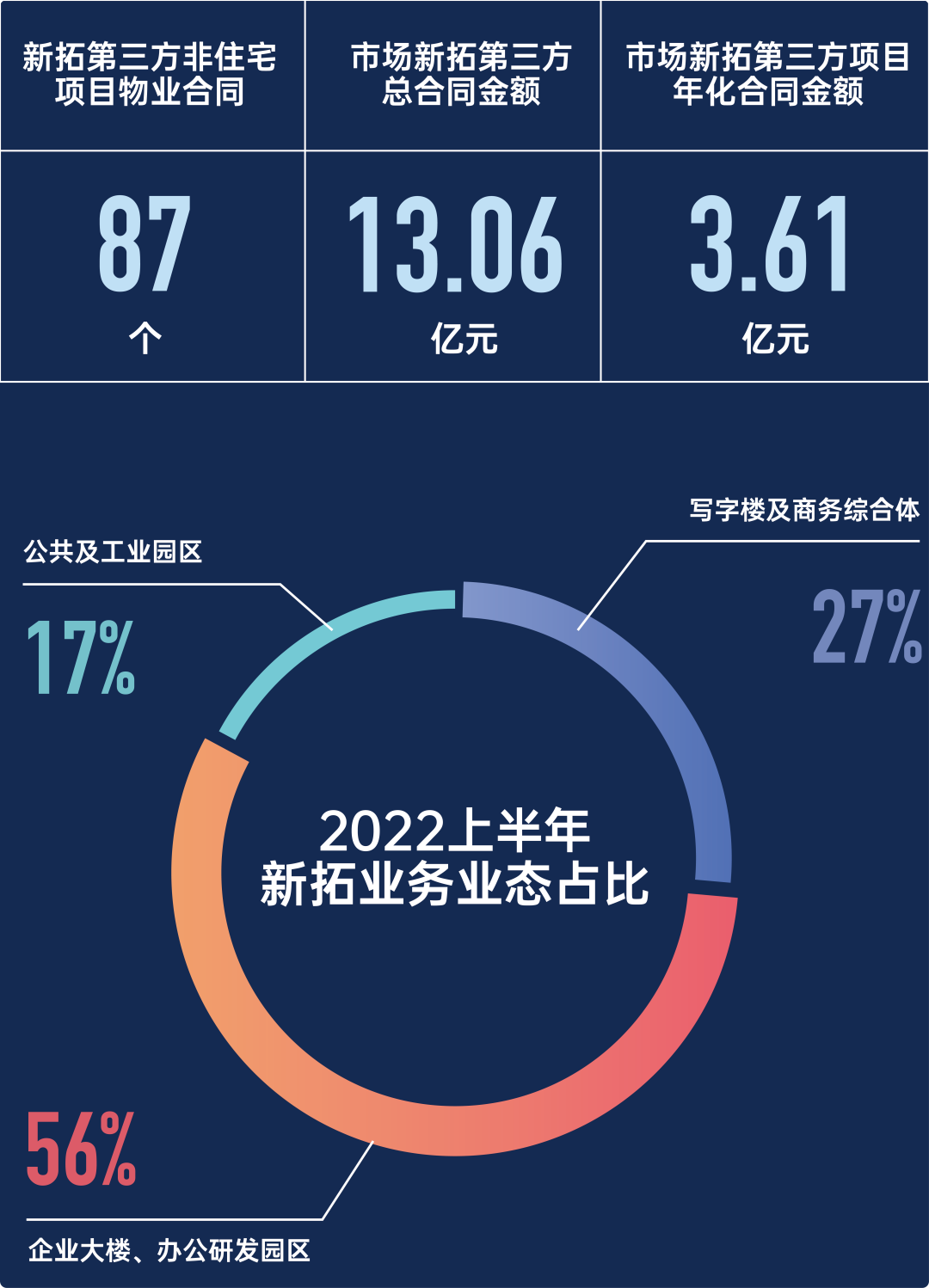 2022年上半年新拓第三方非住宅項目87個,年化合同金額3.61億元,總合同金額13.06億元,其中來自卓越商企服務(wù)自有平臺的拓展貢獻比高達97%。