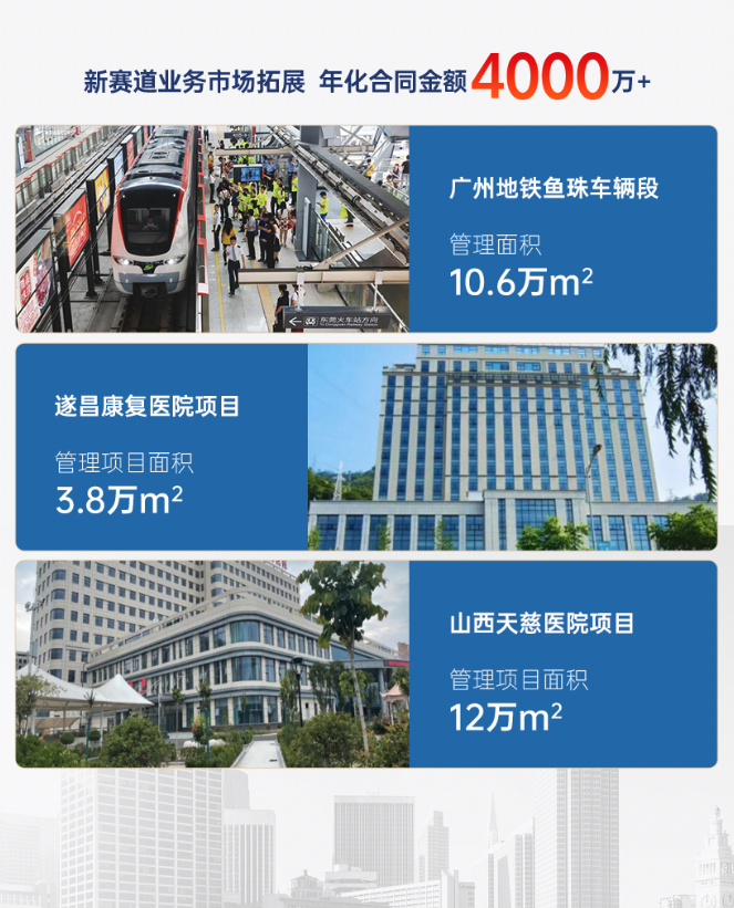 同時,兩大主航道業(yè)務(wù)FM企業(yè)大樓及辦公研發(fā)園區(qū)、PM商辦物業(yè),新拓業(yè)務(wù)持續(xù)快速擴張。