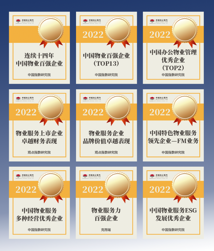 2022年上半年卓越商企服務(wù)斬獲多項榮譽,展示了公司的品牌、實力、責任。上半年,卓越商企服務(wù)憑借自身穩(wěn)健的盈利能力、行業(yè)領(lǐng)先的發(fā)展實力及高品質(zhì)的服務(wù)品牌,獲得了中國物業(yè)百強企業(yè)TOP13、中國辦公物業(yè)管理優(yōu)秀企業(yè)TOP2、物業(yè)服務(wù)上市企業(yè)卓越財務(wù)表現(xiàn)等多項榮譽。