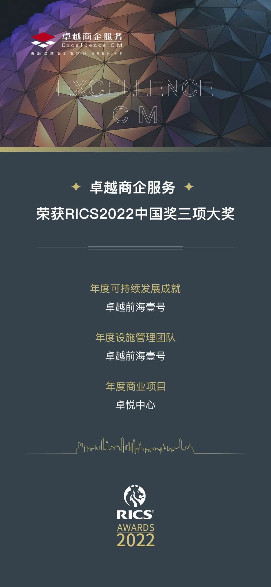 近日,由皇家特許測量師學(xué)會(RICS)主辦的RICS中國峰會暨RICS中國頒獎典禮圓滿落幕。RICS Awards被公認(rèn)為房地產(chǎn)和建筑行業(yè)「奧斯卡」,在全球行業(yè)內(nèi)極具影響力。卓越商企服務(wù)集團(港股上市代碼:6989.HK)作為中國領(lǐng)先的商務(wù)物業(yè)管理服務(wù)提供商,此次所申報的三個項目全部獲得RICS中國獎年度大獎。
