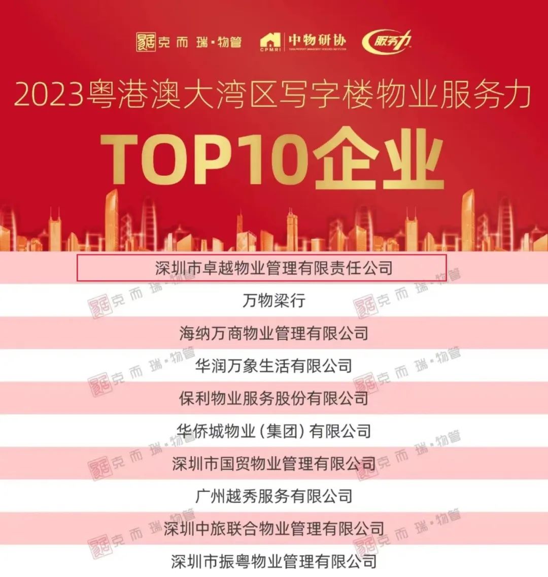 近日,由克而瑞物管、中物研協(xié)主辦的「2023粵港澳大灣區(qū)物業(yè)服務(wù)力百?gòu)?qiáng)峰會(huì)」在深圳隆重舉辦。近200名來(lái)自協(xié)會(huì)、物企、開(kāi)發(fā)商、上下游產(chǎn)業(yè)鏈的行業(yè)領(lǐng)袖們齊聚峰會(huì)現(xiàn)場(chǎng),共話粵港澳大灣區(qū)物業(yè)行業(yè)服務(wù)力課題,洞悉市場(chǎng)變化,解構(gòu)行業(yè)未來(lái)。會(huì)議發(fā)布了「2023粵港澳大灣區(qū)物業(yè)服務(wù)力系列研究成果 」,為物業(yè)行業(yè)樹(shù)立了風(fēng)向標(biāo)。卓越商企服務(wù)集團(tuán)作為中國(guó)領(lǐng)先的商務(wù)物業(yè)管理服務(wù)運(yùn)營(yíng)商,繼續(xù)保持在商務(wù)物業(yè)領(lǐng)先優(yōu)勢(shì),在百?gòu)?qiáng)峰會(huì)上榮獲「2023粵港澳大灣區(qū)物業(yè)服務(wù)力百?gòu)?qiáng)企業(yè)」、「2023粵港澳大灣區(qū)寫(xiě)字樓物業(yè)服務(wù)力TOP10企業(yè)(TOP1)」及「2023粵港澳大灣區(qū)物業(yè)服務(wù)力標(biāo)桿項(xiàng)目:東莞晴熙云翠、卓越后海中心」獎(jiǎng)項(xiàng)!