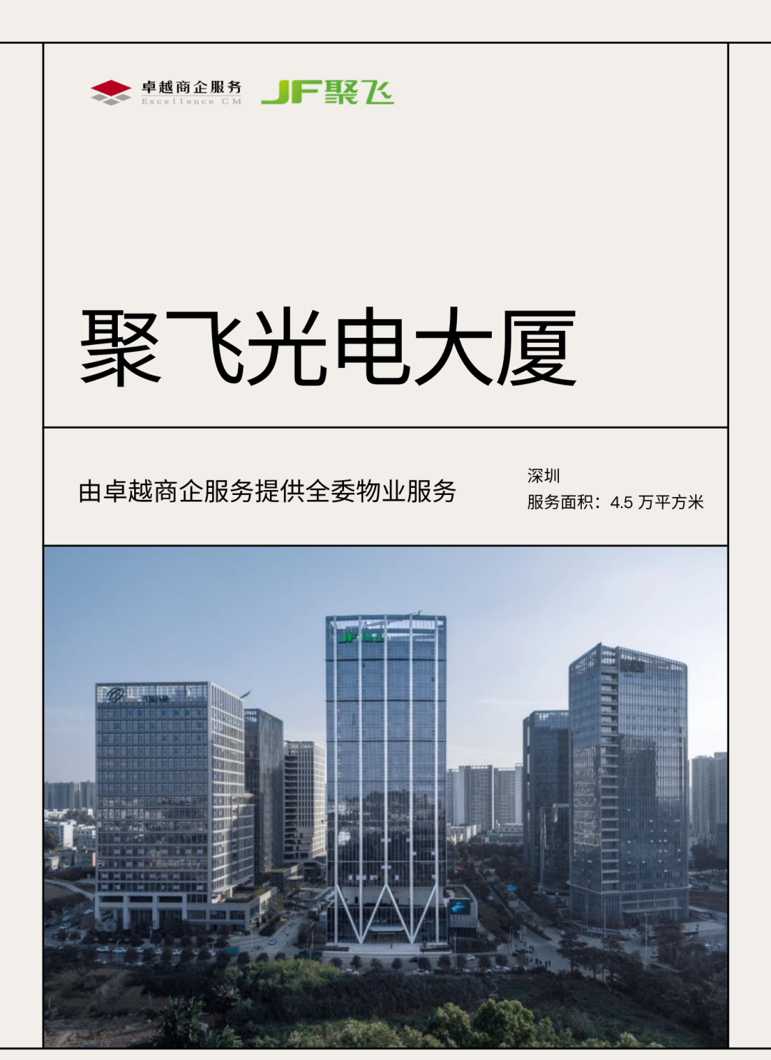 近日,憑借對商務(wù)不動產(chǎn)服務(wù)和對聚飛光電需求的精準理解,卓越商企服務(wù)獲得深圳市聚飛光電股份有限公司的信任和委托,全面承接聚飛光電大廈,與其達成合作,提供設(shè)施設(shè)備運維、客戶服務(wù)、安保管理、能源管理等全生命周期物業(yè)運維服務(wù),總服務(wù)面積約4.5萬平方米。