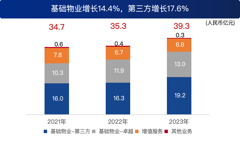 2023年,卓越商企服務(wù)通過主動壓降關(guān)聯(lián)方的業(yè)務(wù)規(guī)模提升了獨(dú)立性。從營收占比來看,公司對關(guān)聯(lián)方的依賴度也明顯下降?;A(chǔ)物業(yè)收入同比增長14.4%,增速提升7.4%,其中,公司第三方基礎(chǔ)物業(yè)2023年增長約2.9億,較2022年多增2.6億?;颈P持續(xù)實(shí)現(xiàn)較快擴(kuò)張,這也為業(yè)主增值服務(wù)的增長奠定了良好的基礎(chǔ)。