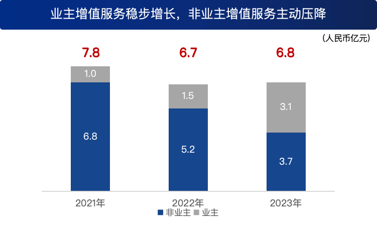 2023年,公司在業(yè)主增值服務(wù)錄得良好的增勢。業(yè)主增值服務(wù)作為增值服務(wù)的主要收入增長點(diǎn),同比大幅增長105%,非業(yè)主增值服務(wù)主動壓降,收入同比下降29.0%。伴隨基礎(chǔ)物業(yè)外延增長的同時進(jìn)一步提升滲透率,業(yè)主增值服務(wù)在增值服務(wù)收入中的占比顯著提升23個百分點(diǎn)至46%”