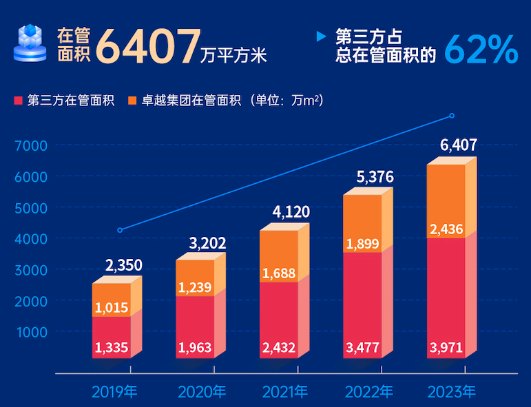 2023年,卓越商企服務(wù)持續(xù)夯實(shí)商務(wù)物業(yè)核心優(yōu)勢,積極展開多業(yè)態(tài)布局、拓展新賽道,尤其是圍繞具備高價值高潛力的物管領(lǐng)域展開布局,同時提升自身外拓能力,增強(qiáng)業(yè)務(wù)獨(dú)立性。截止2023年底,公司在管面積中,第三方在管面積占比達(dá)到了62%。與此同時,非住宅物業(yè)在管面積則達(dá)到了61%。
