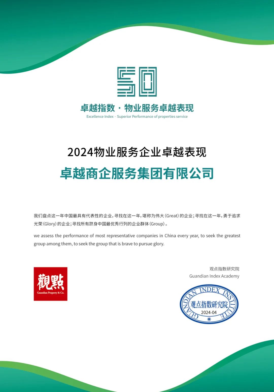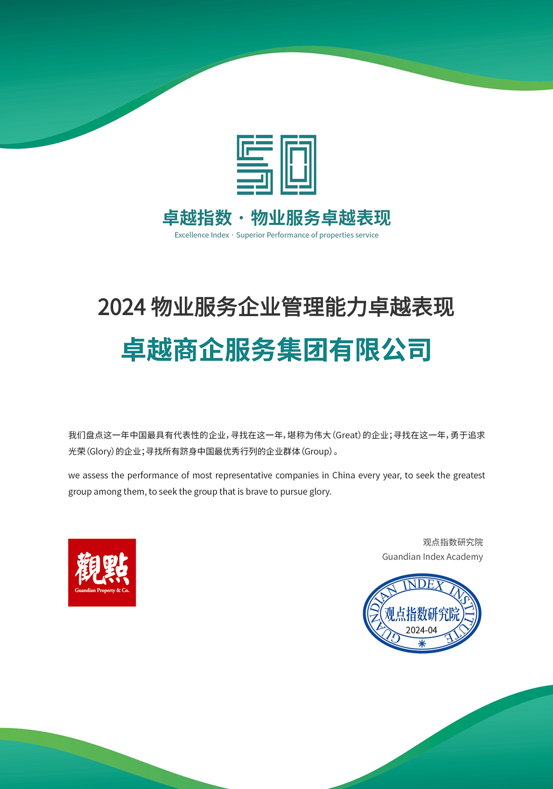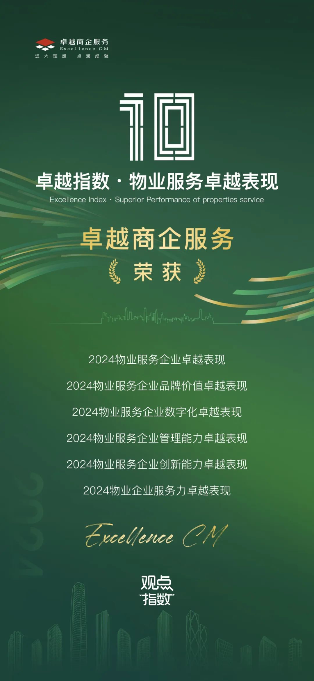 2024年4月11日,由觀點機構(gòu)主辦的「2024觀點物業(yè)大會」在深圳召開。大會現(xiàn)場發(fā)布了《卓越指數(shù) ? 2024物業(yè)服務(wù)企業(yè)卓越表現(xiàn)報告》,卓越商企服務(wù)憑借行業(yè)領(lǐng)先的優(yōu)勢及卓越的管理能力榮獲 「2024物業(yè)服務(wù)企業(yè)卓越表現(xiàn)」、「2024物業(yè)企業(yè)數(shù)字化卓越表現(xiàn)」、「2024物業(yè)服務(wù)企業(yè)管理能力卓越表現(xiàn)」、「2024物業(yè)企業(yè)創(chuàng)新能力卓越表現(xiàn)」、「2024物業(yè)企業(yè)服務(wù)力卓越表現(xiàn)」、「2024物業(yè)服務(wù)企業(yè)品牌價值卓越表現(xiàn)」等多項殊榮!