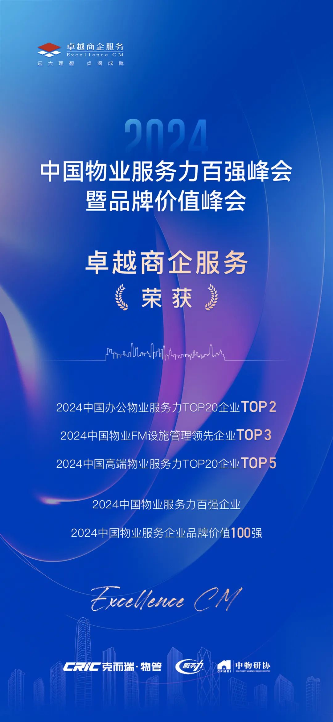 2024年5月17日,由克而瑞物管&中物研協(xié)主辦、安徽省社區(qū)服務(wù)業(yè)協(xié)會(huì)協(xié)辦的「2024中國(guó)物業(yè)服務(wù)力百?gòu)?qiáng)峰會(huì)暨品牌價(jià)值峰會(huì)」在合肥隆重舉辦。卓越商企服務(wù)集團(tuán)作為中國(guó)領(lǐng)先的商務(wù)物業(yè)管理服務(wù)提供商,憑借在高端商務(wù)物業(yè)的領(lǐng)先優(yōu)勢(shì)和IFM業(yè)務(wù)領(lǐng)域的先行優(yōu)勢(shì),被克而瑞物管&中物研協(xié)評(píng)為「2024中國(guó)辦公物業(yè)服務(wù)力TOP20企業(yè)(TOP2)」、「2024中國(guó)物業(yè)FM設(shè)施管理領(lǐng)先企業(yè)(TOP3)」、「2024中國(guó)高端物業(yè)服務(wù)力TOP20企業(yè)(TOP5)」等物業(yè)細(xì)分賽道領(lǐng)先獎(jiǎng)項(xiàng)。