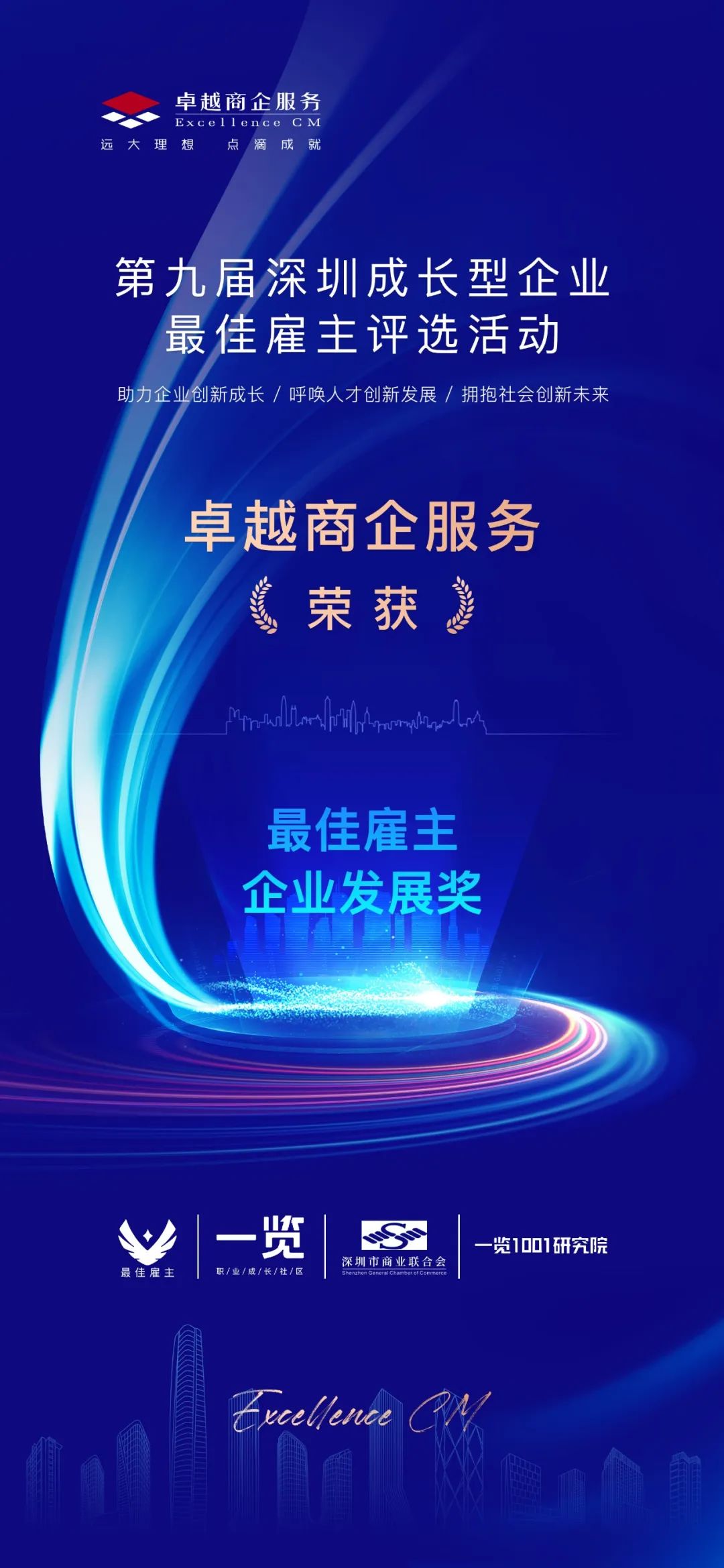 2023年5月11日,由深圳市商業(yè)聯(lián)合會主辦的「第九屆深圳成長型企業(yè)最佳雇主頒獎典禮」在深圳南山圓滿舉行,會上公布了「第九屆深圳成長型企業(yè)最佳雇主評選活動獲獎榜單」,卓越商企服務(wù)憑借在人力資源戰(zhàn)略、人才發(fā)展、ESG發(fā)展、組織創(chuàng)新等方面做出的卓越表現(xiàn),榮獲「最佳雇主-企業(yè)發(fā)展獎」。作為中國商務(wù)物業(yè)服務(wù)行業(yè)的頭部企業(yè),卓越商企服務(wù)一直將雇主品牌的建設(shè)和發(fā)展作為企業(yè)戰(zhàn)略方針,夯實人才根基,為員工創(chuàng)造更全面和立體的成長環(huán)境,推動企業(yè)長遠(yuǎn)發(fā)展。