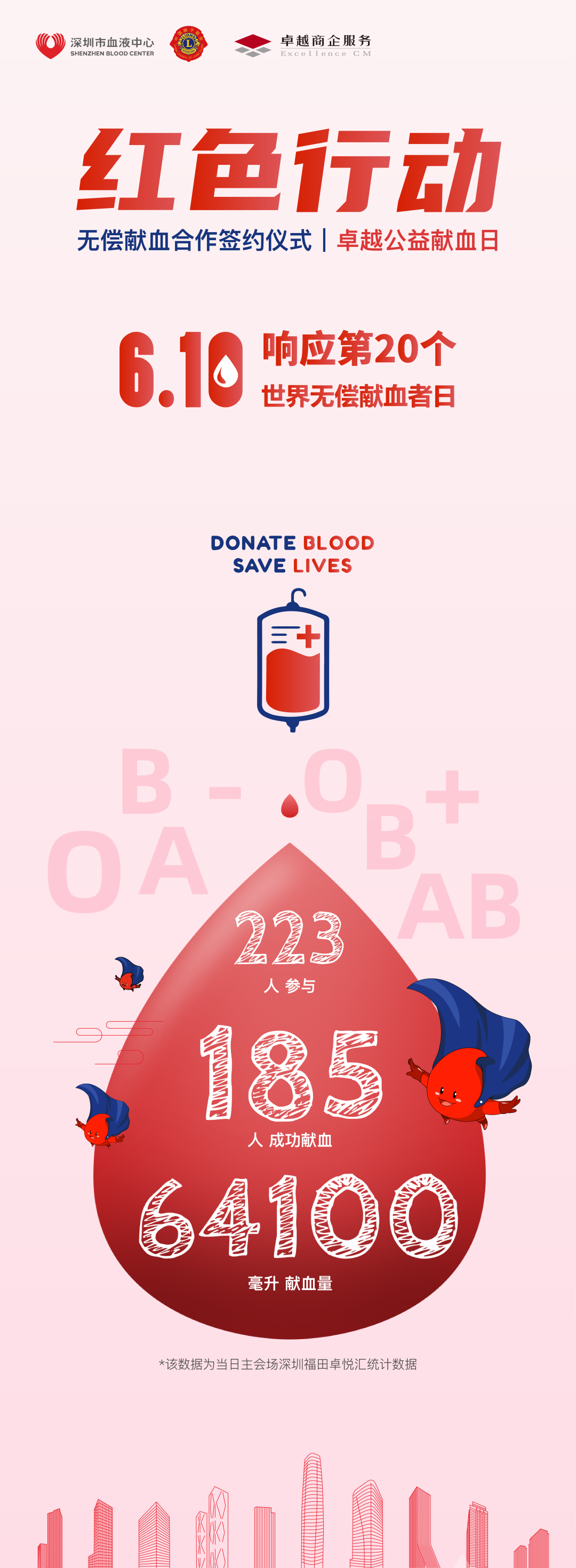 6月10日,在深圳市血液中心、深圳獅子會(huì)支持下舉辦的卓越商企服務(wù)集團(tuán)與深圳市血液中心、深圳獅子會(huì)的無(wú)償獻(xiàn)血合作簽約儀式在深圳福田卓悅匯成功舉辦,同時(shí)也是本次「“血脈相連,守望相助”向生命致敬」無(wú)償獻(xiàn)血活動(dòng)開幕,在現(xiàn)場(chǎng)燃起一股“熱血”浪潮。
