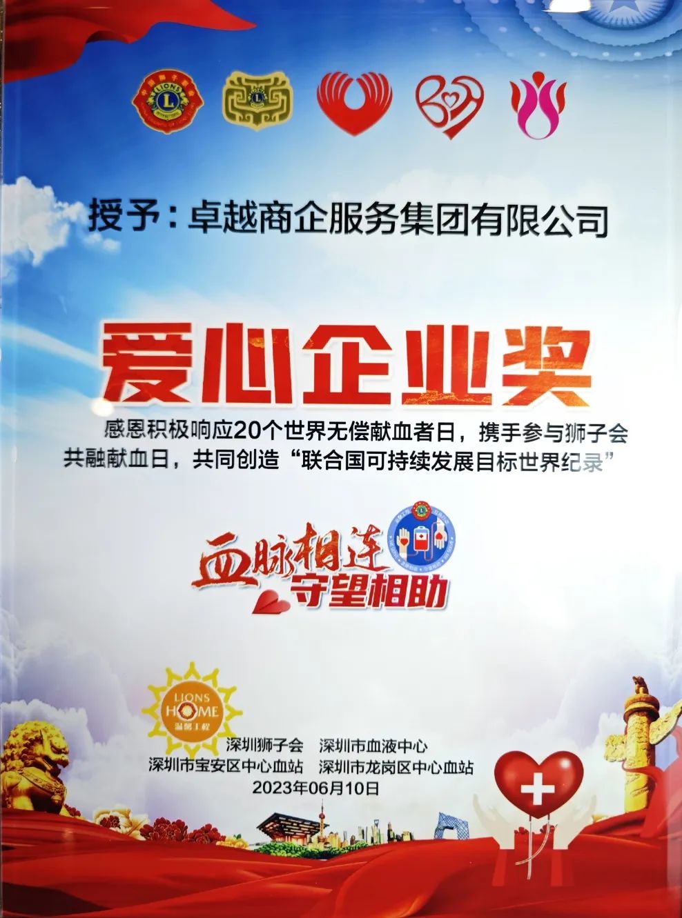△卓越商企服務(wù)獲得由深圳市血液中心、深圳獅子會(huì)頒發(fā)的“愛心企業(yè)獎(jiǎng)”