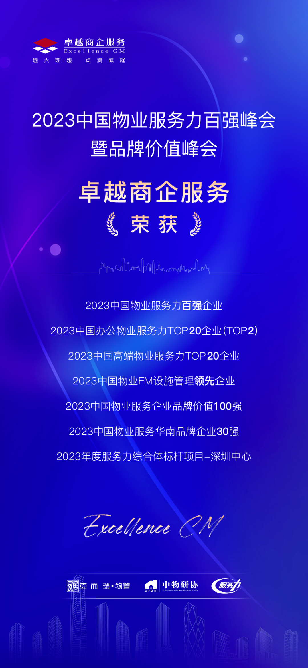 此次卓越商企服務(wù)在管超大型綜合體項目——「深圳中心」獲得2023年服務(wù)力綜合體標(biāo)桿項目,正是憑借著卓越商企服務(wù)多年來優(yōu)質(zhì)的商務(wù)服務(wù)能力和持續(xù)為客戶創(chuàng)造價值的服務(wù)品質(zhì)。